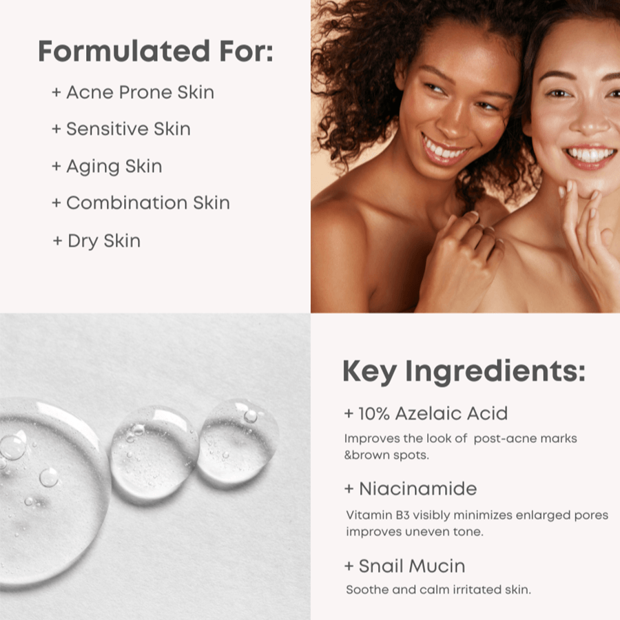 Este serum está formulado para unificar y aclarar el tono de la piel, y para calmar y reducir el enrojecimiento en la piel. Ideal para pieles propensas al acné que buscan calmar y suavizar la piel. También contiene ingredientes que reducen la hiperpigmentación y aumentan la iluminación de la piel.