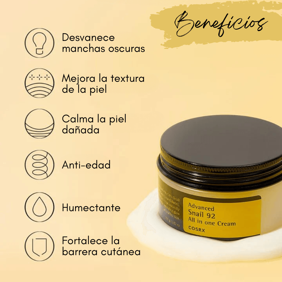 Crema humectante enriquecida con 92% de baba de caracol para nutrir la piel. Es una solución en crema Todo en Uno que repara y calma la piel irritada y sensible depués de los brotes. Se absorbe rápidamente en la piel, dejándola suave e hidratada.