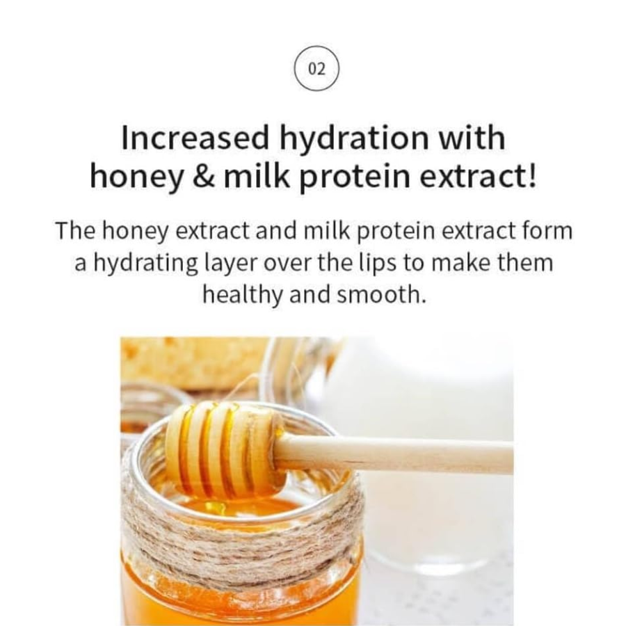 Este aceite para labios tiene una fórmula oleosa densamente adherente, que garantiza una hidratación prolongada, manteniendo los labios firmes y afelpados. Enriquecido con extractos de miel y proteínas de leche, forma una capa hidratante para unos labios sanos y suaves. Tiene un suave aroma a leche que levanta y refresca el ánimo. Ofrece un acabado sedoso y no pegajoso que garantiza un uso cómodo durante todo el día. Suave fórmula apta para usuarios de todas las edades, que proporciona un cuidado esencial de los labios.