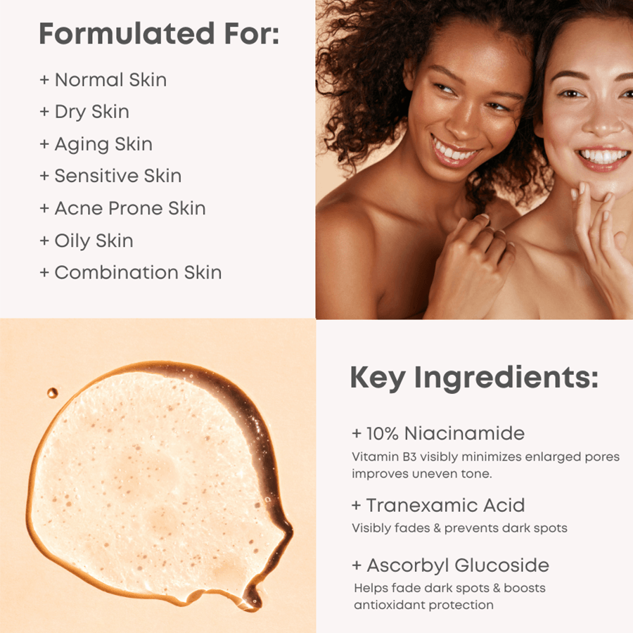 Este serum potencía la piel radiante con sus ingredientes de niacinamida, ácido tranexámico y ascorbyl glucoside, nutriendo, unificando el tono de la piel, reduciendo manchas oscuras y minimizando poros agrandados.