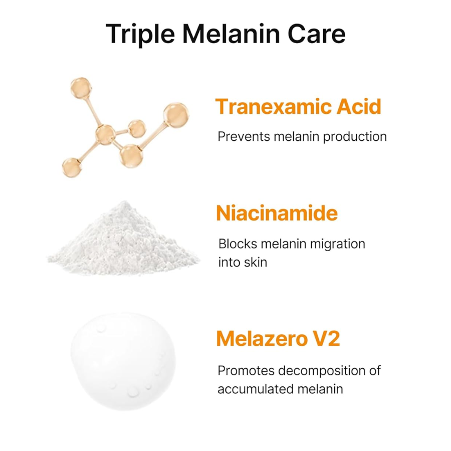 Este serum de triple tratamiento antimanchas actúa sobre los poros, las manchas oscuras y el tono desigual de la piel. Formulado con un 5% de Niacinamida, un 3% de Ácido Tranexámico y un 1% de Melazero V2, proporcionando un cuidado completo de la melanina. Además, es hidratante e iluminador de la tez, hidratando tu piel en profundidad. La fórmula de ácido hialurónico vegano garantiza una amplia hidratación, por lo que es perfecto para el uso diario. Su textura es no pegajosa, ligeramente translúcido y en forma de gel que se absorbe rápidamente en la piel. Envasado con una cómoda bomba que hace que tu rutina de cuidado de la piel sea pan comido. Ideal para pieles sensibles, este sérum hipoalergénico no contiene perfume y está enriquecido con ingredientes de origen vegetal como la Houttuynia Cordata (Heartleaf) y la Alantoína, que proporcionan un cuidado calmante a las pieles reactivas, a la vez que iluminan el cutis. Clínicamente probado y respaldado por 10 ensayos clínicos, demostrando una mejor hidratación, un cutis más uniforme, poros reducidos y un tono y textura de la piel mejorados en tan sólo dos semanas.