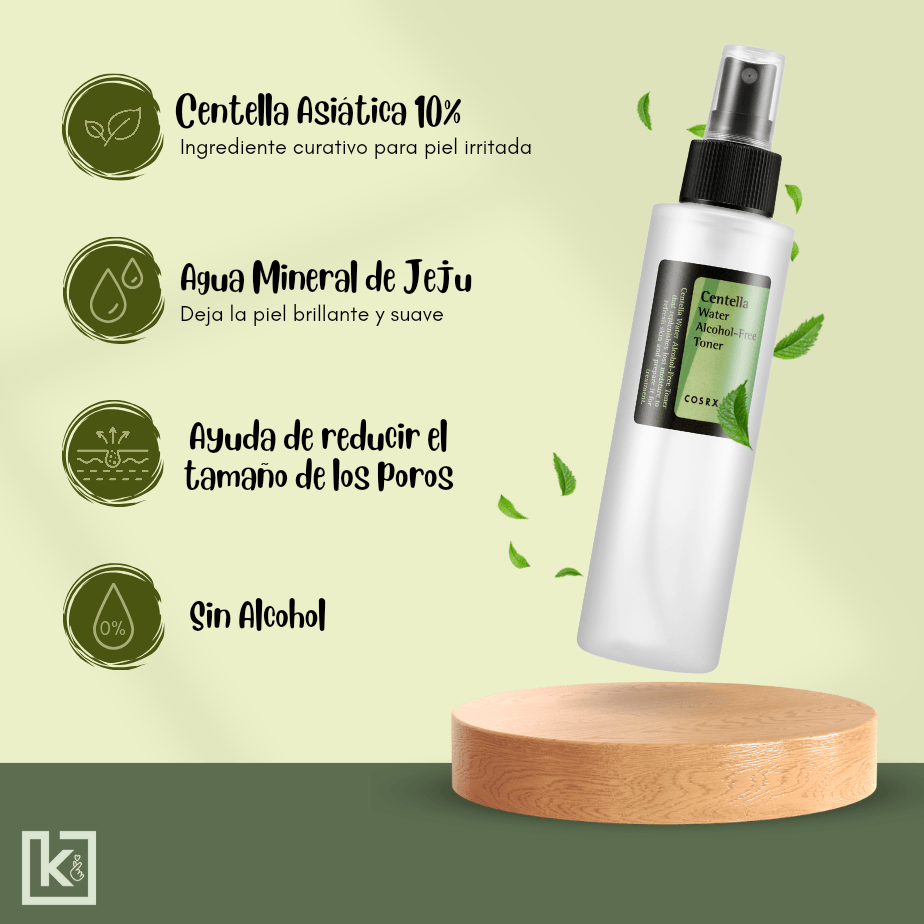 Tóner sin alcohol, hecho con 10% de Centella Asiática y 82% de Agua mineral de la Isla de Jeju, que ayuda a calmar la piel irritada e inflamada, dejando una piel suave y brillante. También ayuda a reducir el tamaño de los poros y mantiene un pH adecuado para la piel.
