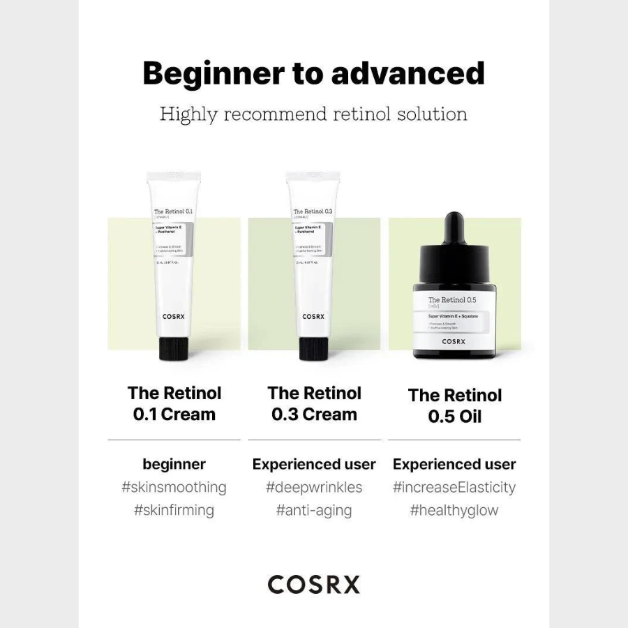 COSRX El Retinol 0,3 es adecuado para personas con experiencia con productos de retinol, centrándose en aquellos que buscan hacer frente a las arrugas más profundas, pérdida de elasticidad de la piel, textura y tono desigual, y las preocupaciones relacionadas con los poros. Es especialmente eficaz para los tipos de piel más maduros o para aquellos que buscan prevenir y tratar los signos del envejecimiento. Su textura es rica y cremosa para ayudar a crear una piel suave y refinada
