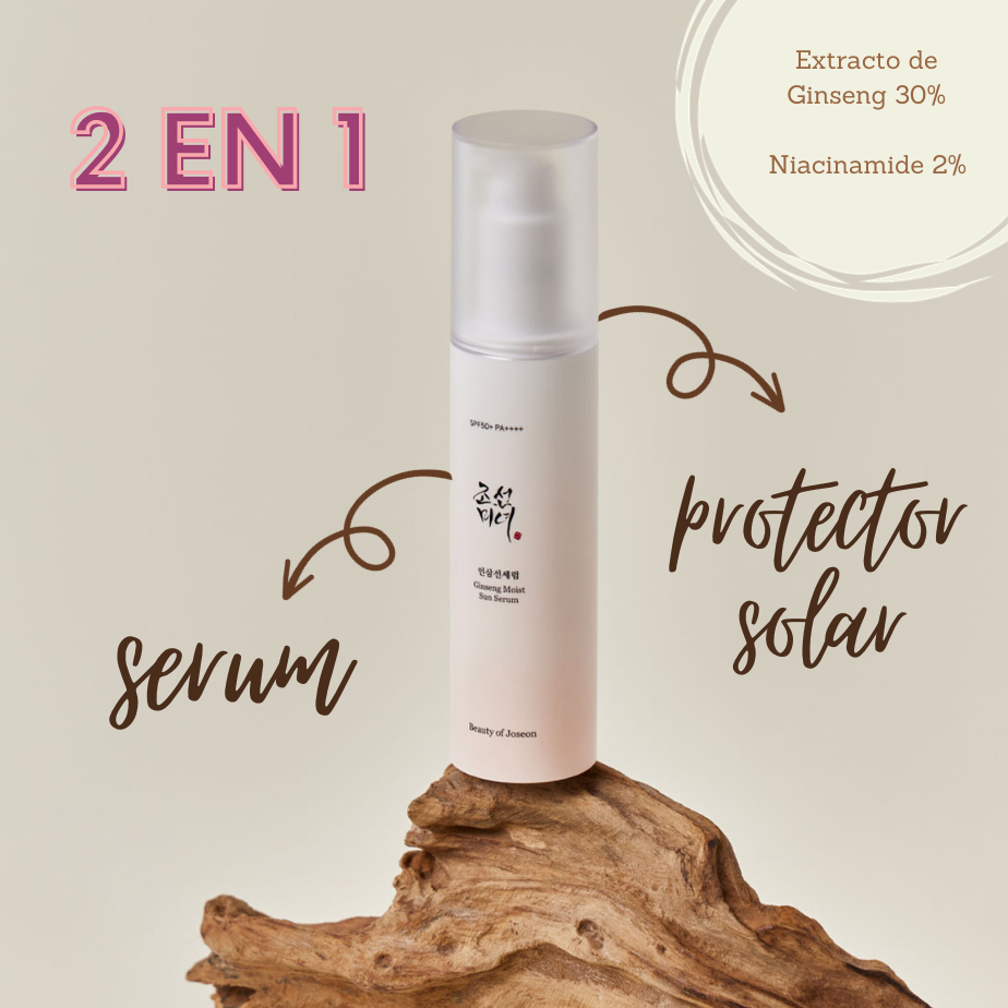 Serum y protector solar al mismo tiempo. Los rayos UV dañan el tejido de la piel, reduciendo la elasticidad y, por lo tanto, el envejecimiento. Con este serum+protector solar SPF 50+ PA++++ puedes hacer dos pasos en uno. De esta manera obtienes la protección del sol y el cuidado de la piel, sin las desventajas del protector solar. No deja la piel con una capa blanca ni grasosa o pegajosa. No olvides reaplicar algún bloqueador cada 2 o 3 horas, como el Matte Sun Stick: Mugwort + Camelia de Beauty of Joseon, que es fácil de transportar y aplicar.