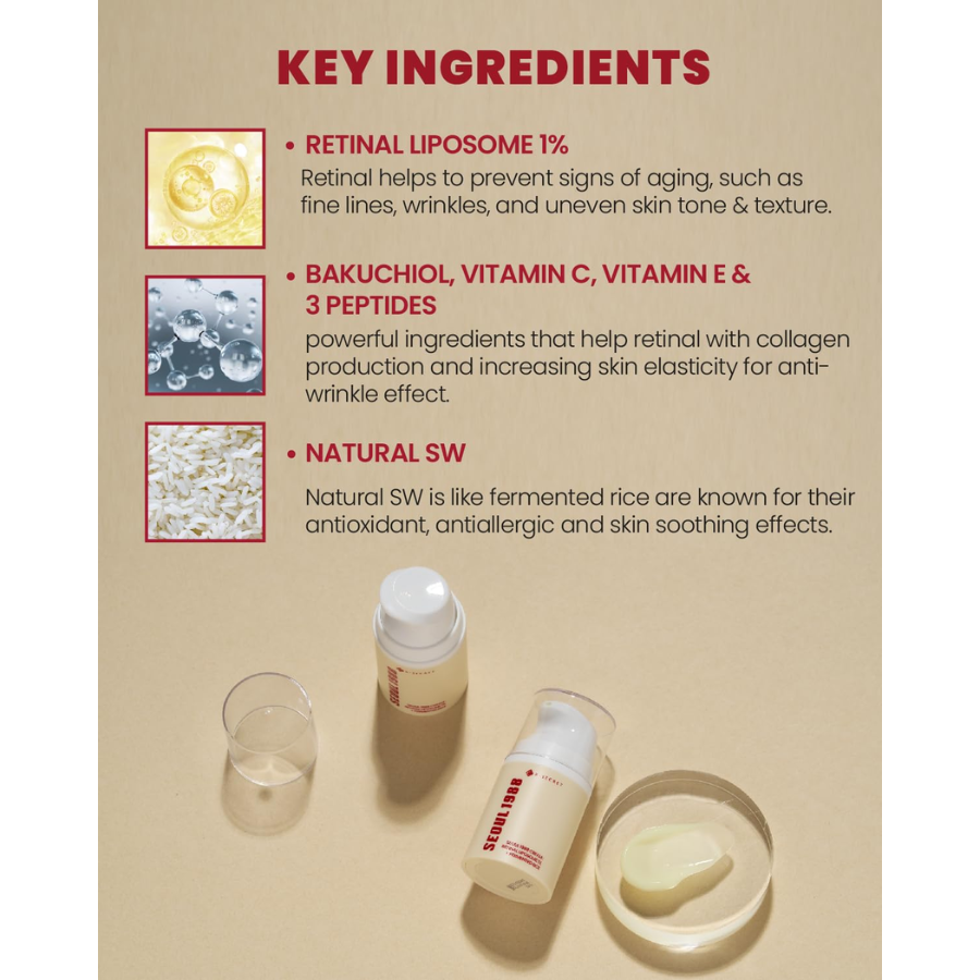 Esta crema antienvejecimiento contiene liposoma de retinal 1% que ayuda a prevenir los signos de la edad, como líneas de expresión, arrugas y tono y tectura desigual. Contiene Bakuchiol, Vitamina C, Vitamina E y Péptidos, que son ingredientes poderosos para ayudar al retinal con la producción de colágeno, aumentando la elasticidad de la piel para un efecto antiarrugas. Si arroz fermentado es conocido por sus beneficios antioxidantes y calmantes. El retinal actúa 11 veces más rápido que el retinol convencional, proviendo de un cuidado efectivo de arrugas y pigmentación. Usando la tecnología de liposomas maximiza la efectividad y reduce la irritación.