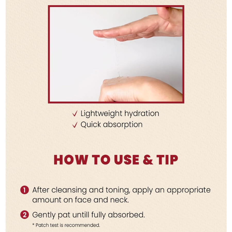 Modo de uso: Aplica una cantidad adecuada en el rostro y cuellos limpio y tonificado. Da pequeñas palmaditas para mejorar su absorción.