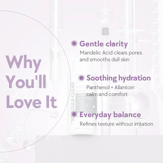 Este suave sérum con un 5 % de ácido mandélico ayuda a eliminar las células muertas, desobstruir los poros y suavizar la textura áspera, todo ello sin dañar las pieles sensibles o propensas a los brotes. Equilibrado con hidratantes calmantes, aclara sin picar. Exfoliación suave pero eficaz. El tamaño mayor de las moléculas del ácido mandélico lo hace ideal para pieles sensibles, ya que limpia la congestión y refina el tono sin irritar. El pantenol, la alantoína, el sorbitol y el hialuronato de sodio actúan conjuntamente para hidratar, calmar y reforzar la barrera cutánea. Ya no tendrás que elegir entre claridad y comodidad: este sérum te ofrece ambas cosas. Un producto diario (si se tolera) imprescindible para una piel más suave, luminosa y calmada, incluso cuando tu piel se muestra reactiva. Sin fragancia, con pH equilibrado y formulado para pieles sensibles que siguen buscando resultados.