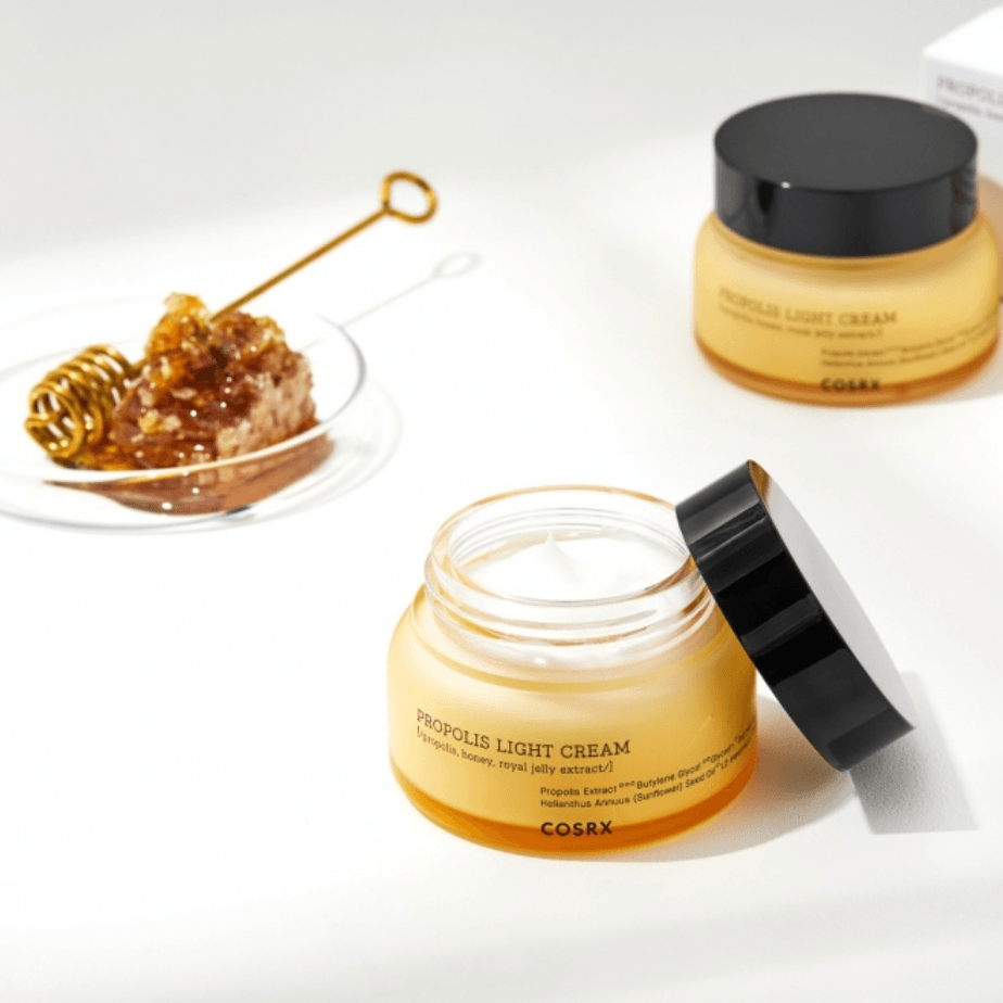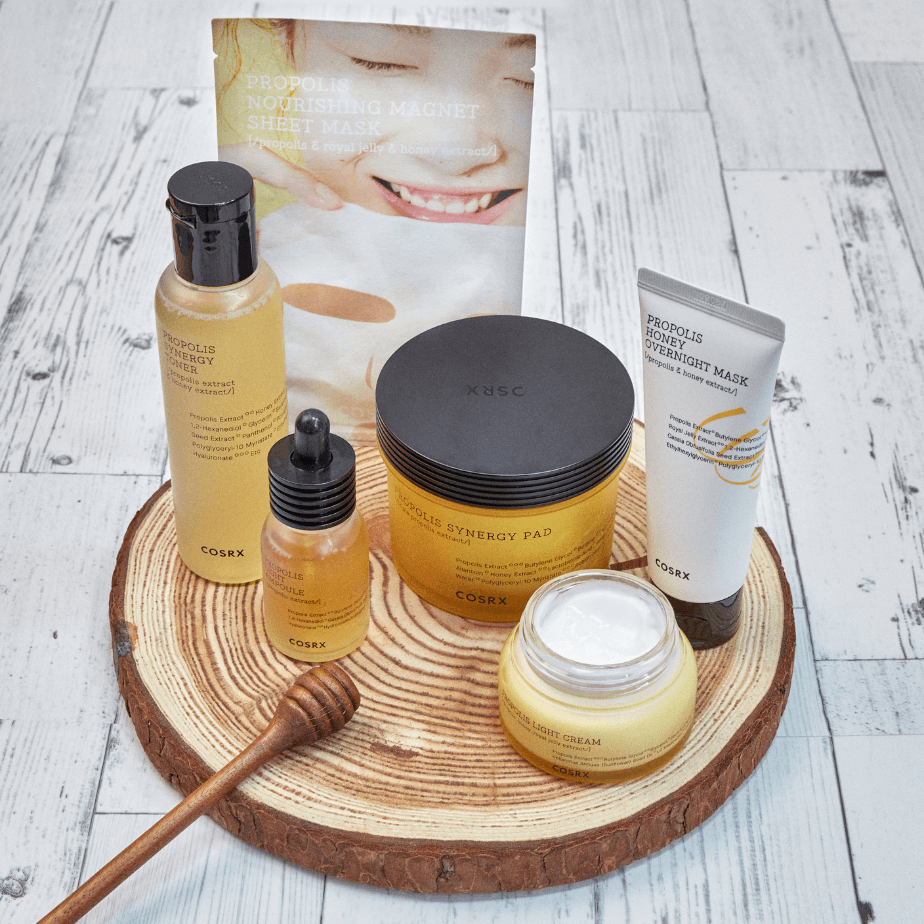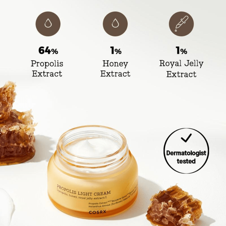 Propolis Extract, Butylene Glycol, Glycerin, Caprylic/Capric Triglyceride, Helianthus Annuus (Sunflower) Seed Oil, 1,2-Hexanediol, Honey Extract, Royal Jelly Extract, Hydroxyethyl Acrylate/ Sodium Acryloyldimethyl Taurate Copolymer, Cassia Obtusifolia Seed Extract, Cetearyl Olivate, Beeswax, Cetearyl Alcohol, Sorbitan Olivate, Allantoin, Arginine, Carbomer, Xanthan Gum