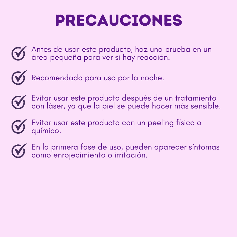 Precauciones antes de usar:Antes de usar este producto, haz una prueba en un área pequeña para ver si hay reacción.