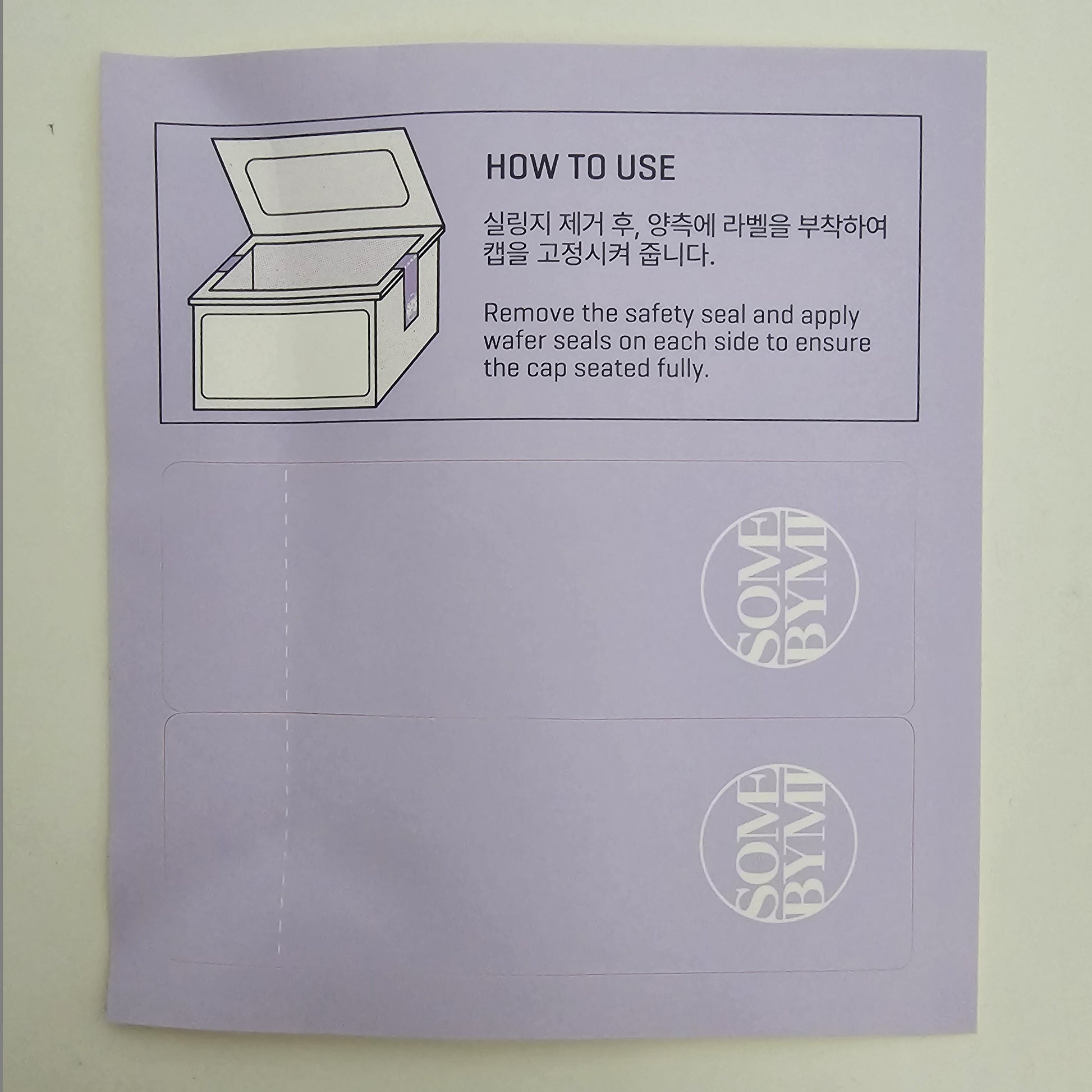 Para abrir el envase retira la tapa completamente, quitando la cinta lateral con logo de Some By Mi y remueve el sello del contenedor por completo y, a continuación, coloca la tapa firmemente sobre el contenedor. Pega las dos cintas incluídas entre la tapa y el contenedor en ambos lados del mismo, tal y como se muestra en el dibujo del sticker incluído. Por favor, abre el contenedor y mantenlo en una posición hacia arriba para evitar derrames.
