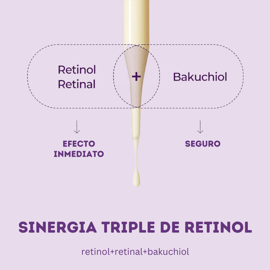 El serum de retinol ofrece un efecto de mejoría en la piel, seguro y poderoso, con su tecnología reactiva que es suave con la piel sensible. Contiene una triple eficacia de Retinol: retinol+retinal+bakuchiol, que promueven una síntesis de colágeno y elastina en la piel. Este serum de diario, también contiene ingredientes como Panthenol, Beta-glucan, ceramidas y Truecica para ayudar a recuperar la piel dañada y fortalecer la barrera cutánea.