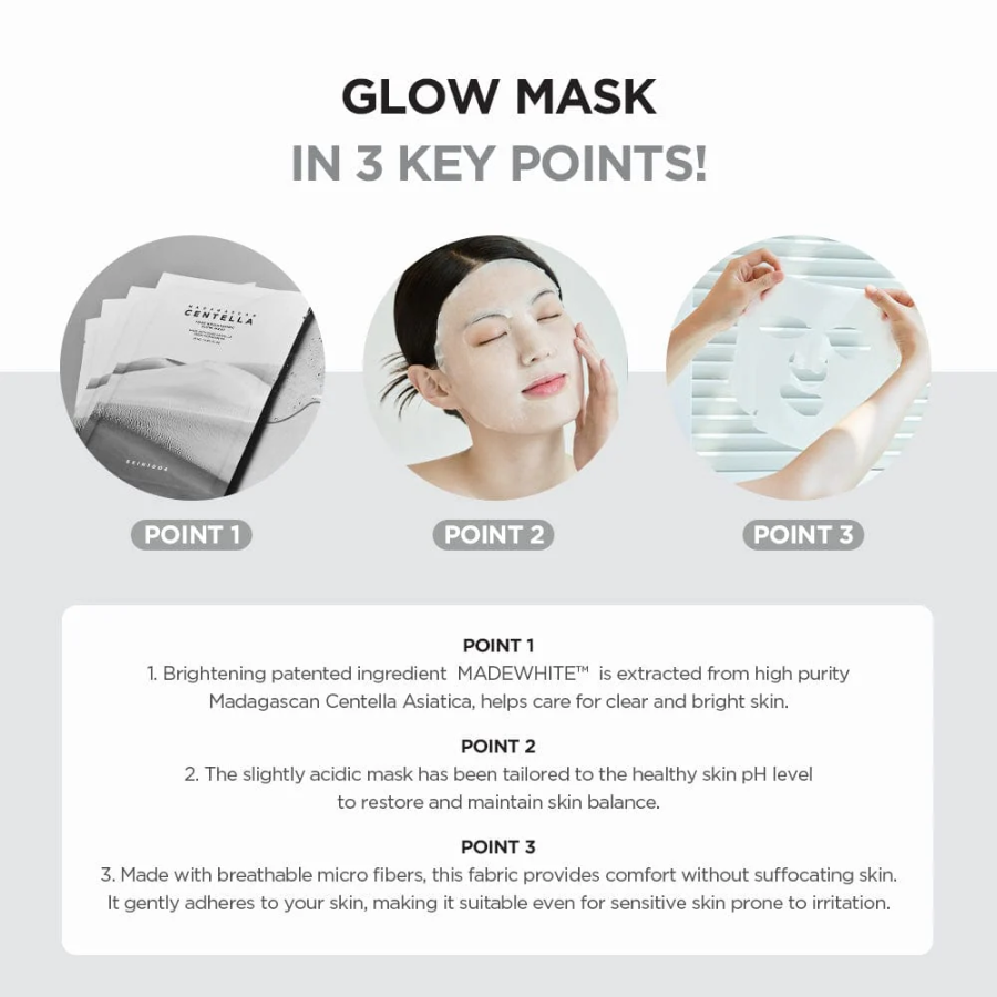 Esta mascarilla contiene ingredientes calmantes y potenciadores de luminosidad. Su textura es como la de una ampolla suave que no deja residuos y provee un efecto refrescante después de la absorción. Contiene ingredientes como extracto de Centella Asiática de Madagascar, niacinamida, ácido tranexámico y ácido ascórbico, que brinda a la piel una mayor claridad, dejando una piel radiante y luminosa.