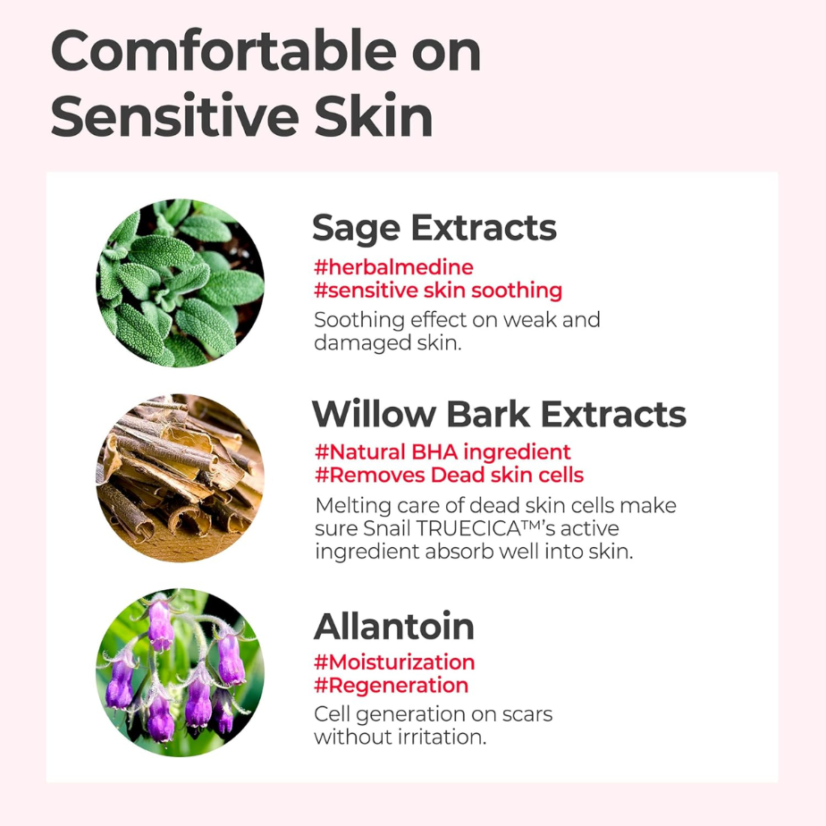 Este seum de caracol contiene una alta concentración de Snail Truecica, 890,000ppm para una recuperación efectiva de la piel, con la mucina del caracol negro conocida por sus habilidades de auto-restauración. El sérum facial refuerza la fuerza natural de la piel a la vez que calma la piel sensible. Además, la fórmula añade extractos como salvia y corteza de abedul blanco para cuidar suavemente la piel dañada sin causar irritación. La mucina de caracol tiene múltiples beneficios para la piel gracias a sus propiedades naturales. Puede atraer y retener la humedad, estimular la producción de colágeno y elastina. Además, la alantoína, presente en la mucina de caracol, puede ayudar a calmar la piel, por lo que es un ingrediente eficaz para la piel sensible. Además, contiene ácido hialurónico, glicoproteínas y proteoglicanos, que ayudan a hidratar la piel, promover la producción de colágeno y reducir la inflamación. Esta línea también contiene Truecica, un agente calmante único que alivia la piel sensible causada por factores externos. Ha superado las pruebas de irritación en pieles sensibles